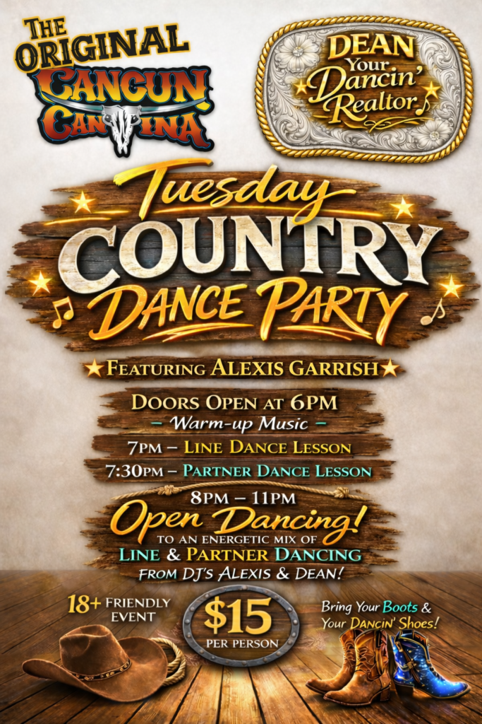 Click here Tuesday Nights Line Dances Announced that NightThe Partner Lessonsin April is WEST COAST SWING Doors open at 6pmWarm up music 6pm – 7pm7pm – Line dance lesson TBA7:30pm – Partner Dance lessons8:15pm – Dean & Alexis DJ a mix of Partner, Line, and Specialty dance music.Cost = $15Beginners Welcome – No Partner needed Wednesday Nights Line Dancing with AlexisEvery Wednesday Doors open at 5pmWarm up music 6pm – 8pm8pm Basic Line Dance lesson8:30pm Beyond the basics9pm – 1am “DJ Joe” Inside playing your favorite line dances“DJ Q” on the Club side from 9pm til close. Friday Nights April Dance LessonsWEST COAST SWING Doors open at 5pmWarm up music 6pm – 7pm7pm Basic dance lesson 7:30pm Beyond the basics8pm – 2am Live music from a variety of artist“DJ Joe” InsideBeginners WelcomeNo Partner Needed Sign up for your Weekly Dance Review Sign up for your Weekly Dance Review